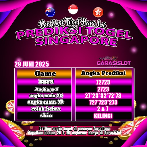 Togel SINGAPORE adalah pasaran terlaris yang hampir tidak pernah tergantikan. Setiap harinya ribuan pengguna memburu dan mencari prediksi jitu seputaran togel Singapore hari ini. Nah, dibawah ini adalah prediksi togel Singapore Pools 29 JUNI 2025 terbaik.